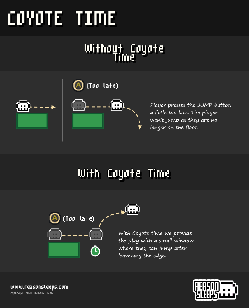 Named after the fantastic Wile E. Coyote from the Looney Tunes and Merrie Melodies series of cartoons, coyote time occurs when the player runs off the edge of a platform and tries to jump a little too late. Similar to the pre-landing jump technique described above, the player feels that they pressed the jump button at the right time but the game ignored the input. Coyote time provides a small window after leaving the platform during which the player can still jump, even though they have technically already walked off the edge.