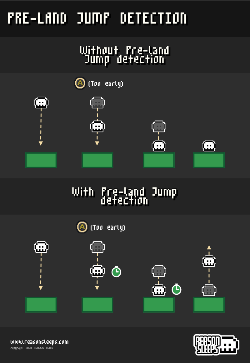 If the player presses jump just before they land, the game will normally disregard the input because the player is not grounded. This can lead to situations where the player feels they pressed jump at the right time, but the game ignored the input. Detecting a pre-landing jump attempt allows the character to jump the moment the player lands if they tried to jump just before touching the ground.